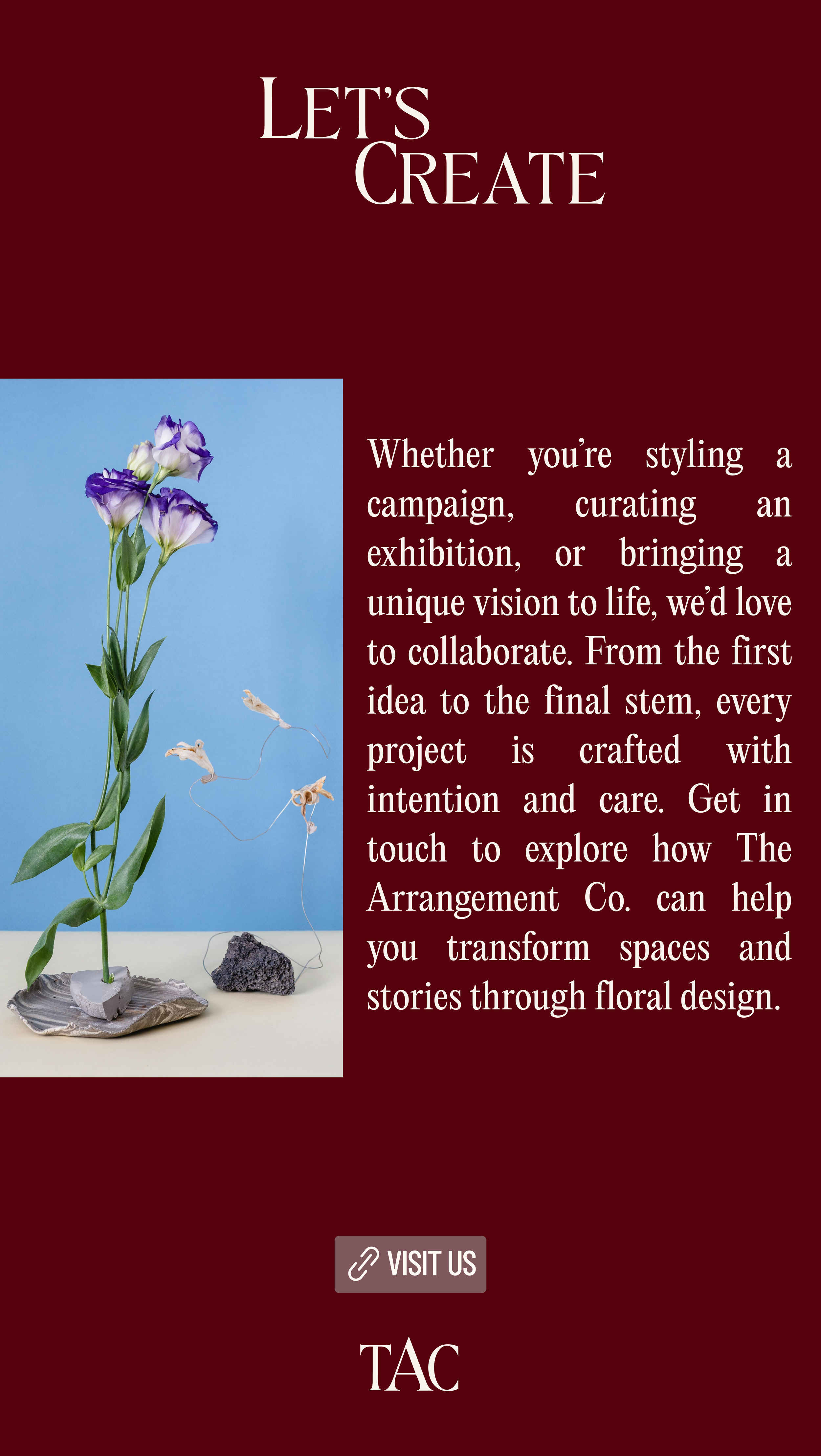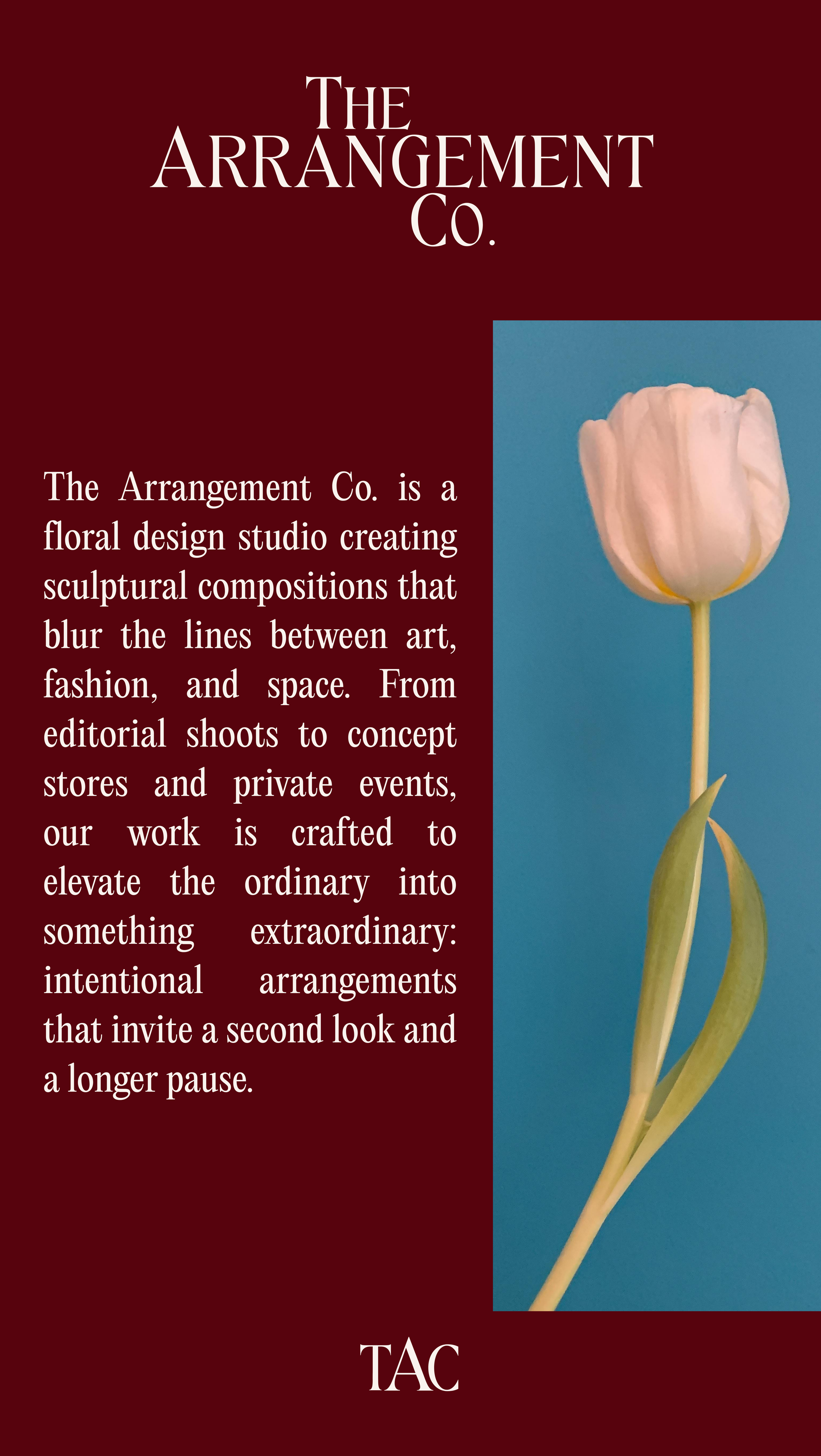The Arrangement Co. is a floral styling studio working at the intersection of fashion, art, and spatial design. With a focus on sculptural, contemporary arrangements, the brand redefines floristry as both an expressive medium and a design practice.